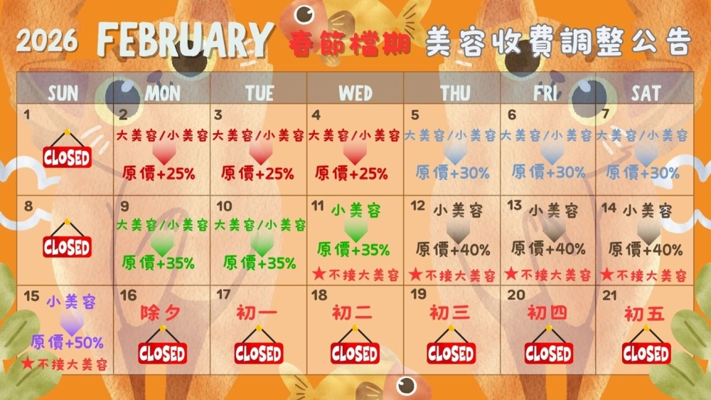 除蚤、藥浴、拆結、貴賓腳、除廢毛、特殊造型、SPA按摩浴等…費用另計 包月美容另有優惠價格